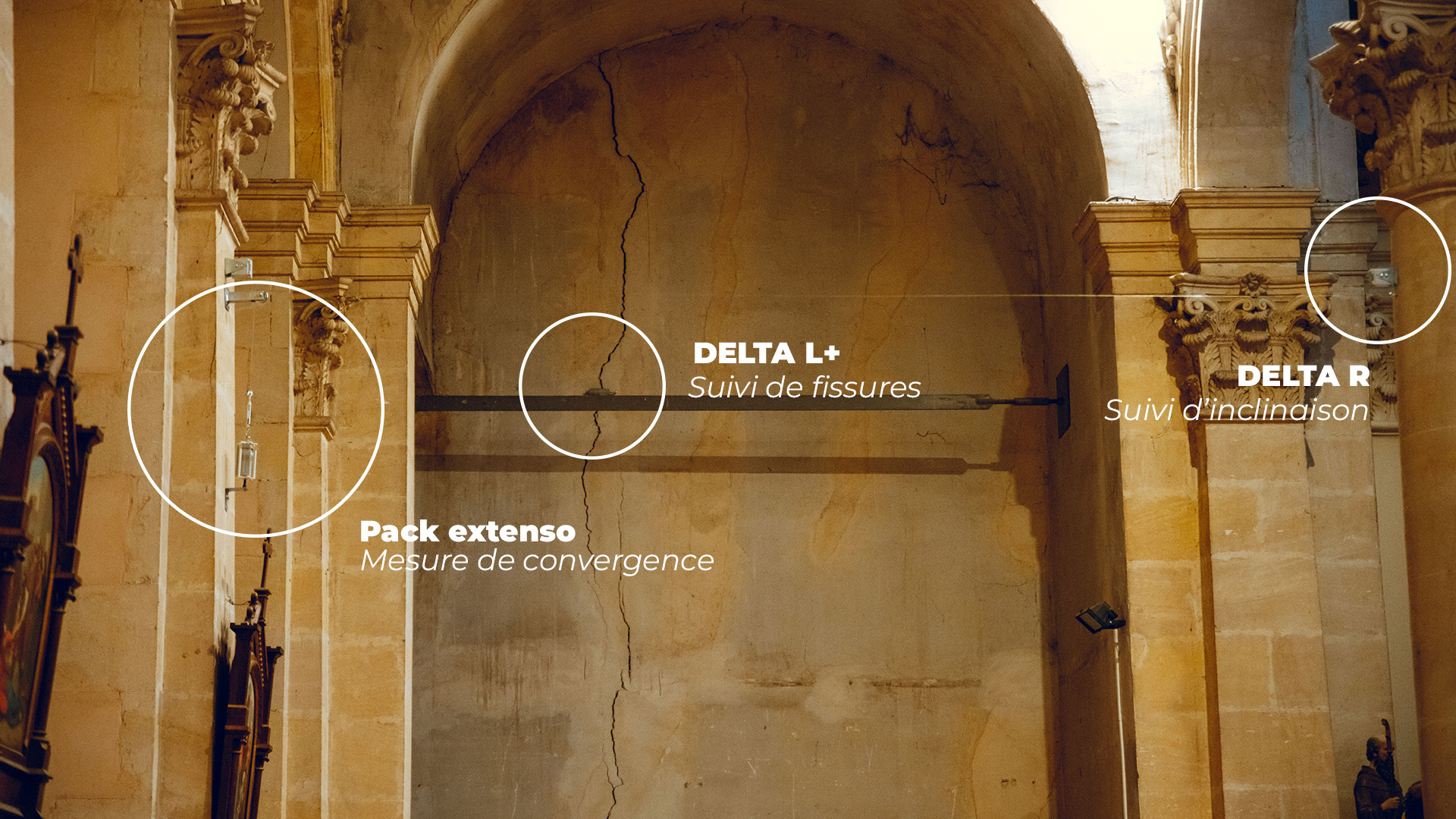 💡 Nos capteurs DELTA L+, DELTA L+ mini, DELTA R, DELTA X-L100 et le pack Extenso, installés discrètement sur les murs, voûtes, arcs ou éléments sensibles, mesurent en continu l’ouverture des fissures, les déplacements différentiels, les variations d’inclinaison ainsi que les déformations de grandes amplitudes.
