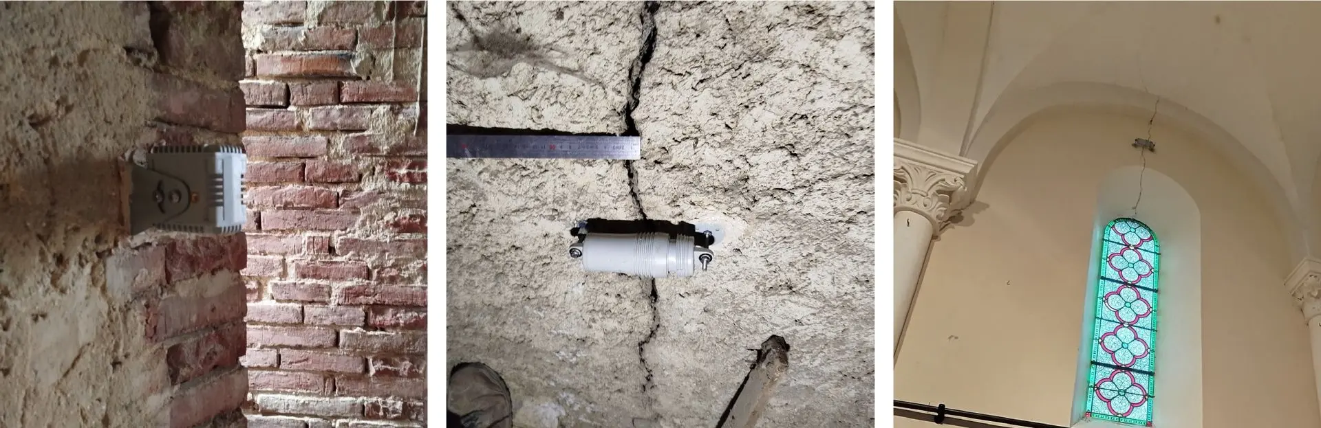 - Quatre capteurs d’ouverture de fissure DELTA L+, installés en nef et en combles pour mesurer les mouvements des fractures traversantes ;